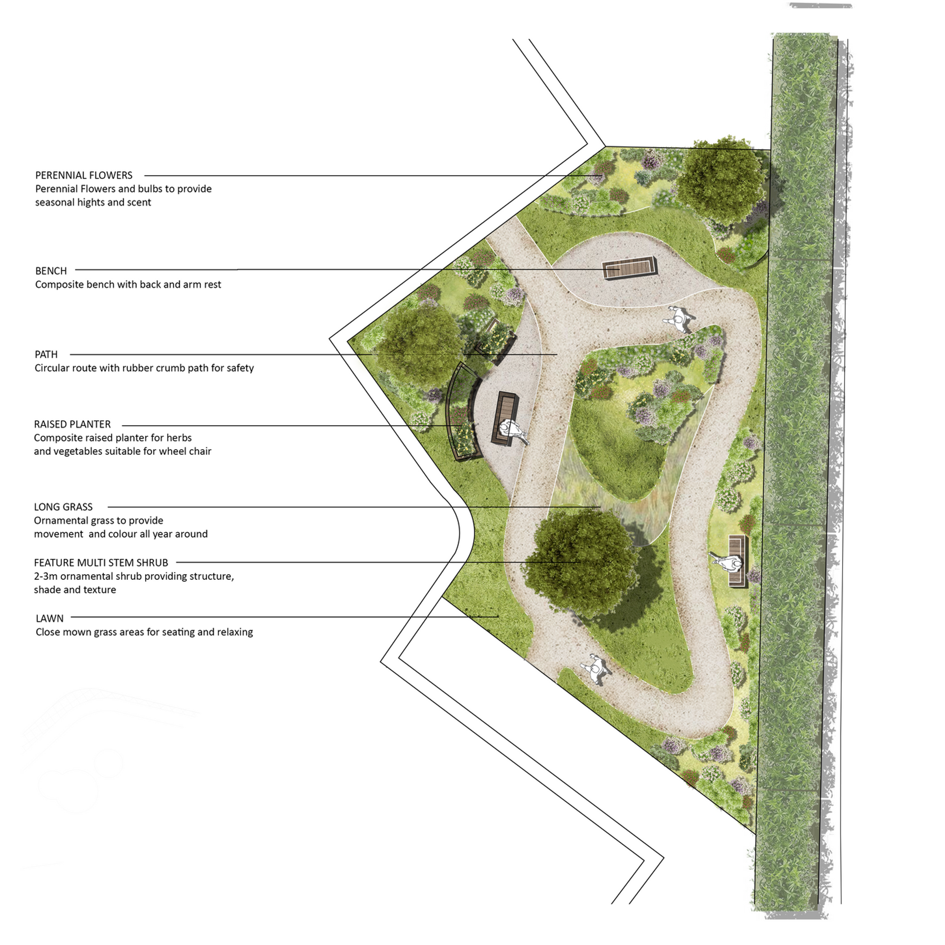 Whilst we strive to create sustainable and enjoyable inclusive landscapes for the future we are also mindful of the those with limited life spans or difficulties in the here and now. We are currently applying the full range of our skills to a number of dementia gardens and those with special needs and have previously worked on community hospitals.